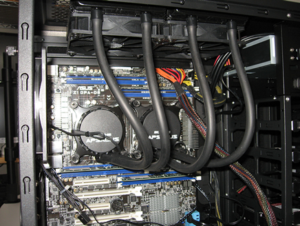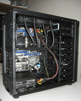 ワークステーション内部。特徴的な2つの丸いポンプが並ぶ。この下に2つのXeonが隠されている。